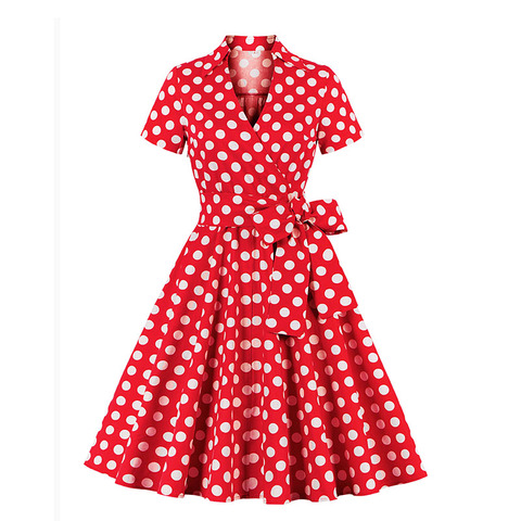 プラスサイズX-4XLヴィンテージポルカドットドレス女性用半袖Vネックスイングベルト50年代60年代ピンナップロカビリーパーティードレスVestidos